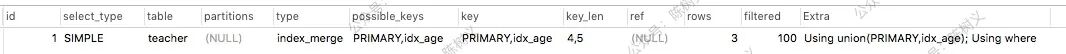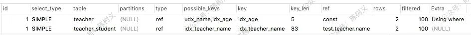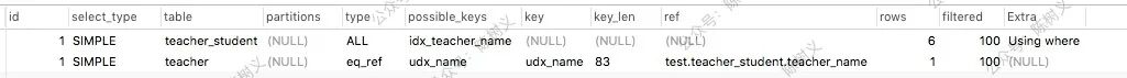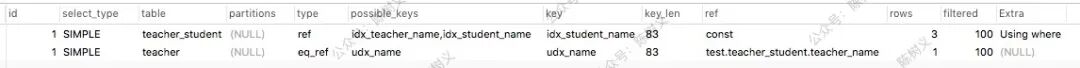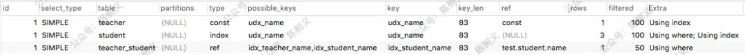 可以看出其 3 个查询都是简单(SIMPLE)查询。因为 ID 相同,所以其查询顺序是按顺序来的。首先从 teacher 表中取出数据,之后从 student 表取出数据,最后 teacher_student 表取数据。