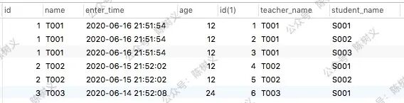 上面的输出一共有 2 条记录,其 ID 都为 1,这表示其归为一组。对于 ID 相同的组,MySQL 按照顺序从上到下执行,即:先拿 teacher_student 表的数据,再拿 teacher 表的数据。