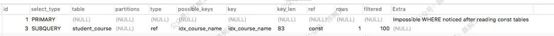 在上面的查询中,首先是执行 ID 为 3 的查询,即去 student_course 表取出选修了数学课的学生名字,之后再去进行最外层的查询。可以看到最外层查询的 select_type 为 PRIMARY。