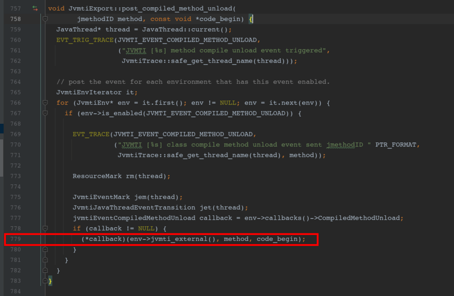 at /usr1/jenkins/HuaweiJDK/open source/openjdk/jdk8u-jdk8u342-ga/hotspot/src/share/wm/prims/jvmtiExport.cpp:779 ,查看对应的源码:我们有很大理由怀疑,极有可能是此处的 callback 函数指针跑飞了,此处的 callback 是干什么的呢?我们上文中提到 ServiceThread 会将事件(compiled_method_load、compiled_method_unload 都属于事件)进行 post 发布以供外部的 JVMTI 客户端监听使用,此处的 callback 就是外部的 JVMTI 客户端注册的回调函数,外部的 JVMTI 客户端利用这个回调函数来执行自己相应的操作,即此处的 callback 指向的地址是由外部的 JVMTI 客户端控制的,我们继续调试: