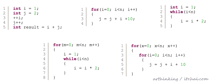 所谓Big-O表示法,就是要得出对程序影响最大的那个因素,用于衡量复杂度,举例说明: