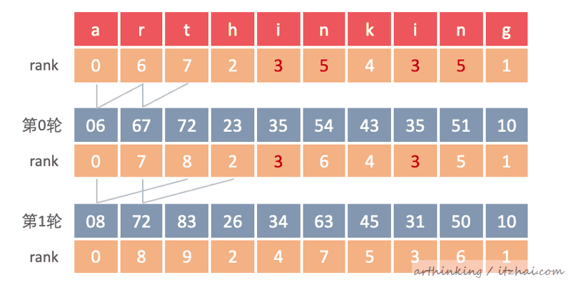 第0轮:suffix[i] = suffix[i] + suffix[2^0],重新评估rank;