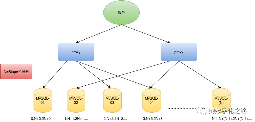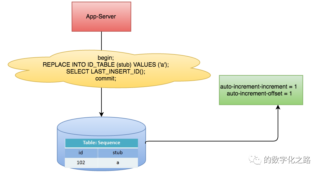原来获取ID每次都需要写数据库,现在只需要把step设置得足够大,比如1000。那么只有当1000个号被消耗完了之后才会去重新读写一次数据库。读写数据库的频率从1减小到了1/step,大致架构如下图所示: