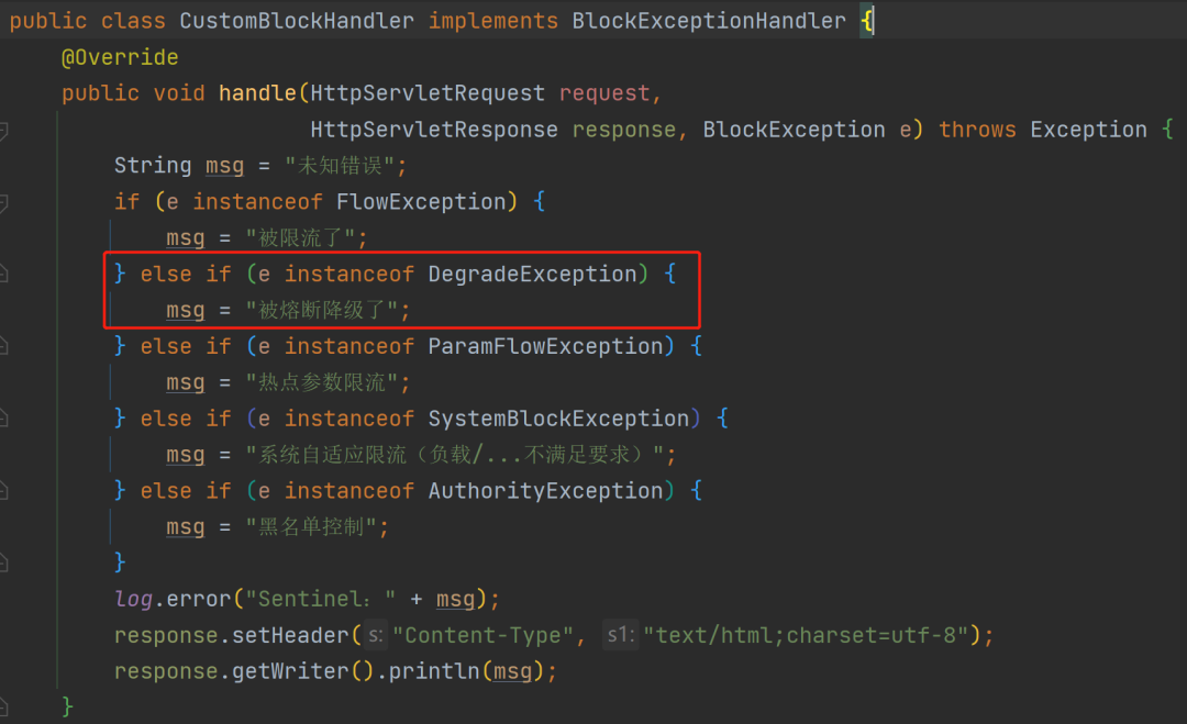 当然,某些框架如 Sentinel,它早期在 Dashboard 控制台中可能叫“降级”,但在新版中新版本又叫“熔断”,如下图所示:但在两个版本中都是通过同一个异常类型 DegradeException 来监听的,如下代码所示: