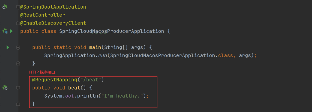 以上这两种方法和 Nacos 的两种健康检查机制类似,也就是客户端主动上报机制,是客户端每隔一段时间,主动向 Nacos 服务器端上报自己的健康状况,而服务器端反向探测机制是 Nacos 服务器端来检测客户端是否健康。