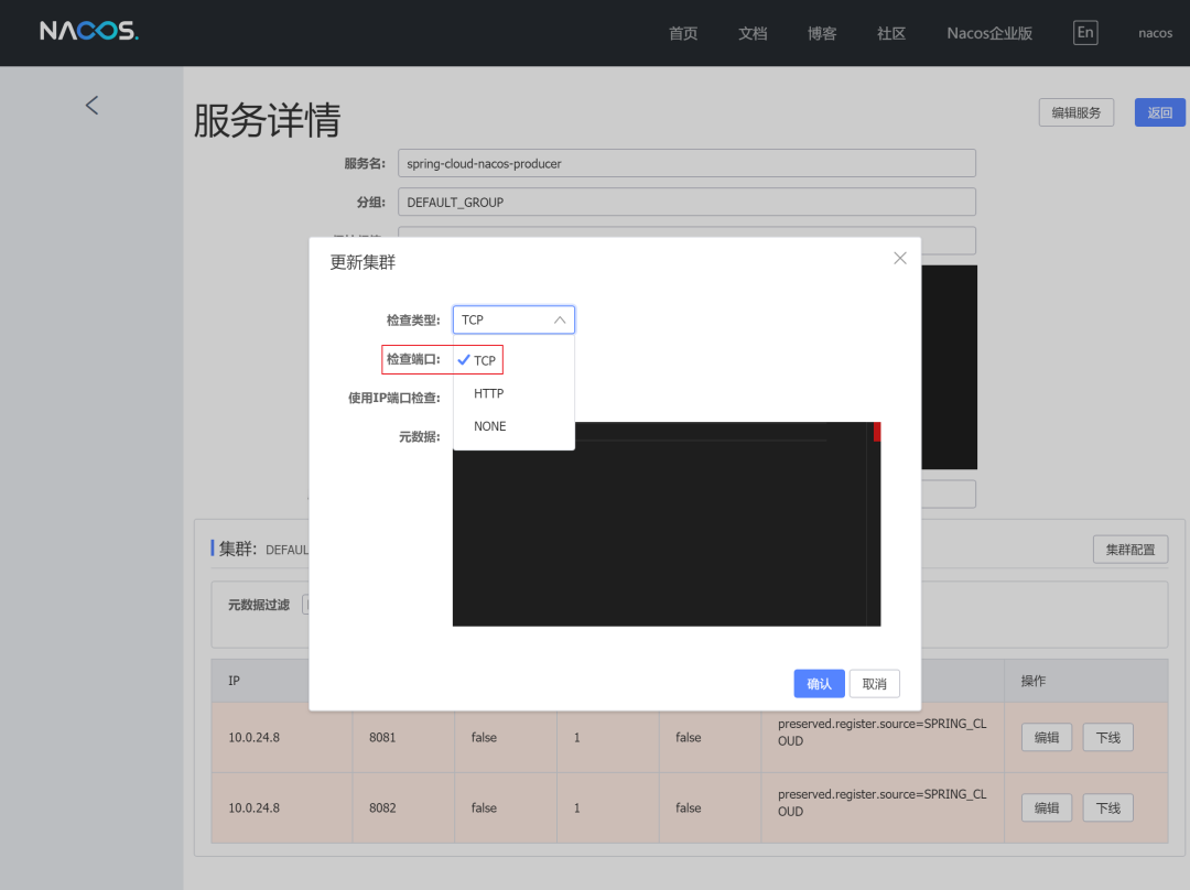 默认情况下,永久实例使用的是 TCP 探测,这点可以在 Nacos 控制台观察到,如下图所示:默认会使用 IP端口来检查,如下图所示:
