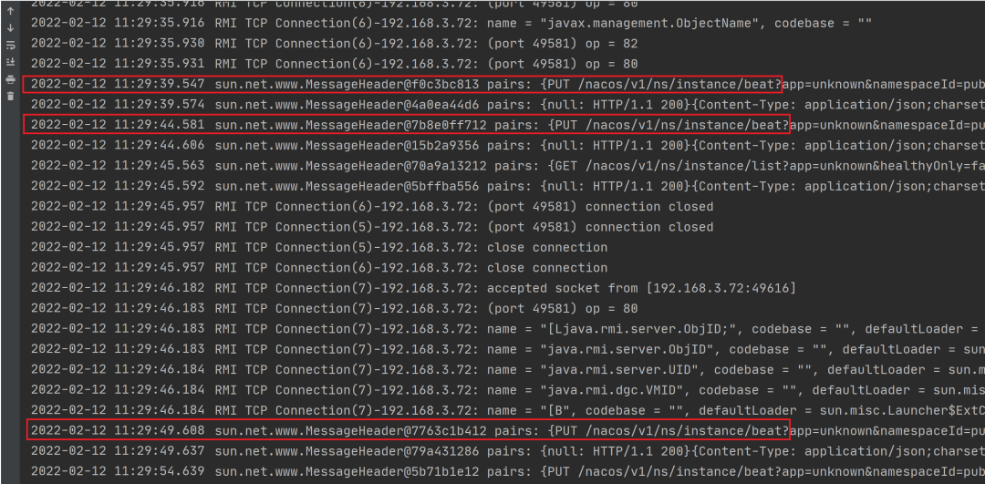 临时实例每隔 5 秒会主动上报一次自己的健康状况,发送的数据包叫做心跳包,发送心跳包的机制叫做心跳机制。如果心跳包的间隔时间超过了 15 秒,那么 Nacos 服务器端就会将此服务实例标记为非健康实例,如果心跳包超过了 30s 秒,那么 Nacos 服务器端将会把此服务实例从服务列表中删除掉。运行 Nacos 项目时,可以看到客户端主动上报心跳包的日志,如下图所示:从上述图片可以看出,Nacos 客户端会以每 5s 一次的频率来上报自己的健康情况,请求信息如下: