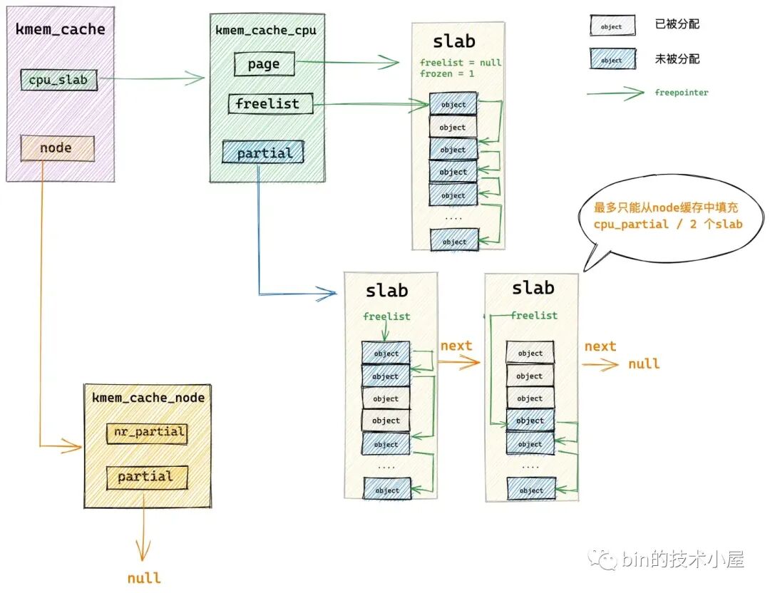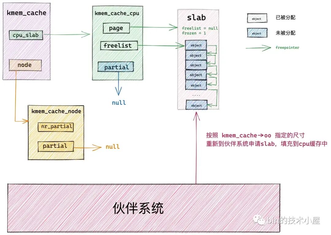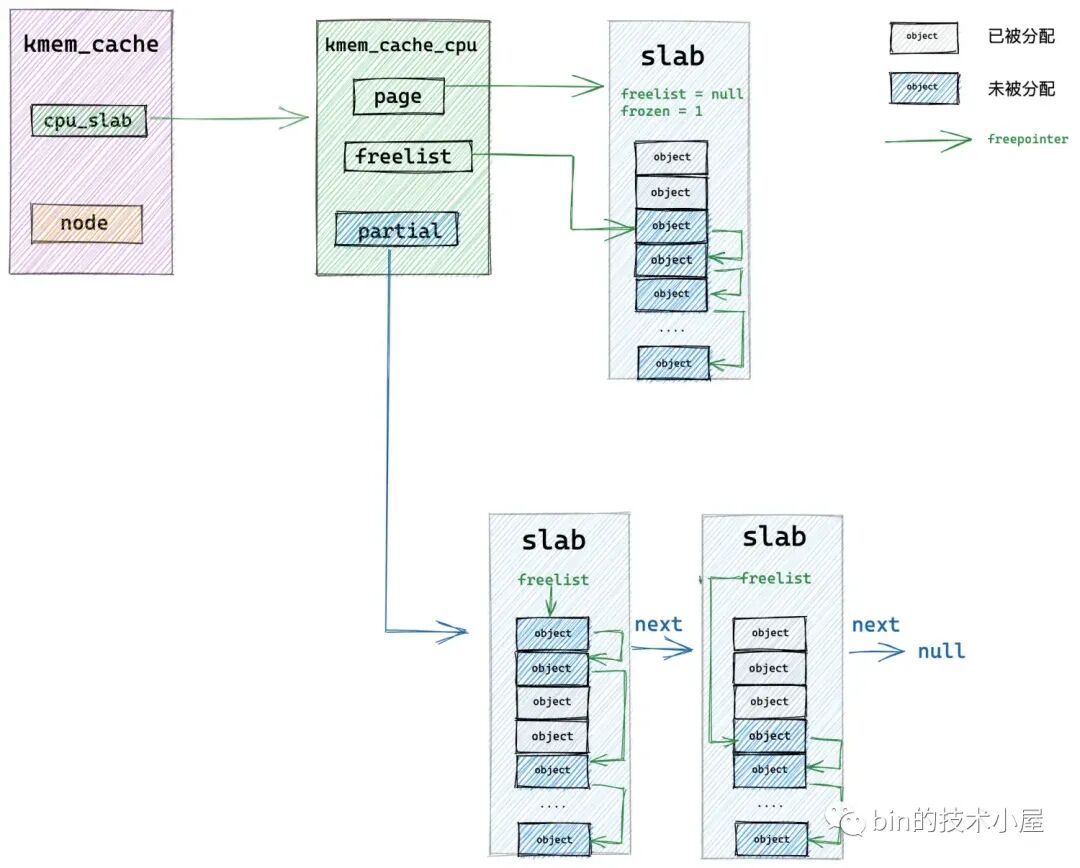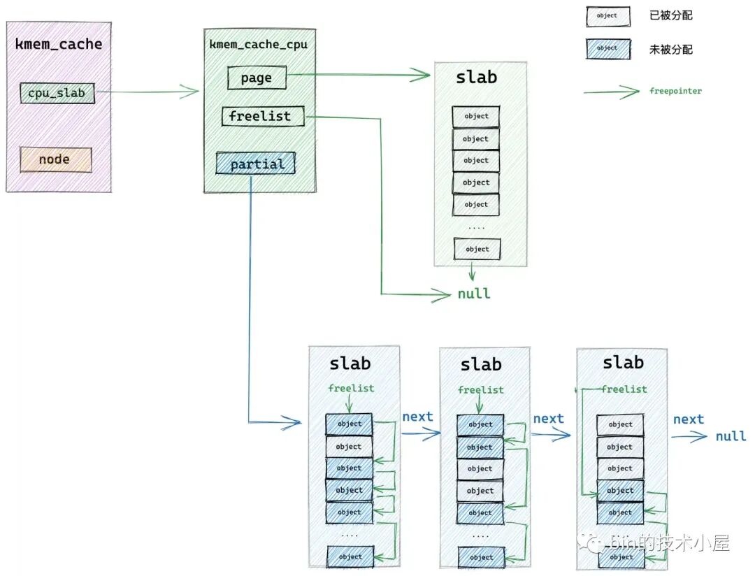 随后内核会通过 kmem_cache_cpu->freelist 来获取 cpu 缓存 slab 中的第一个空闲对象。