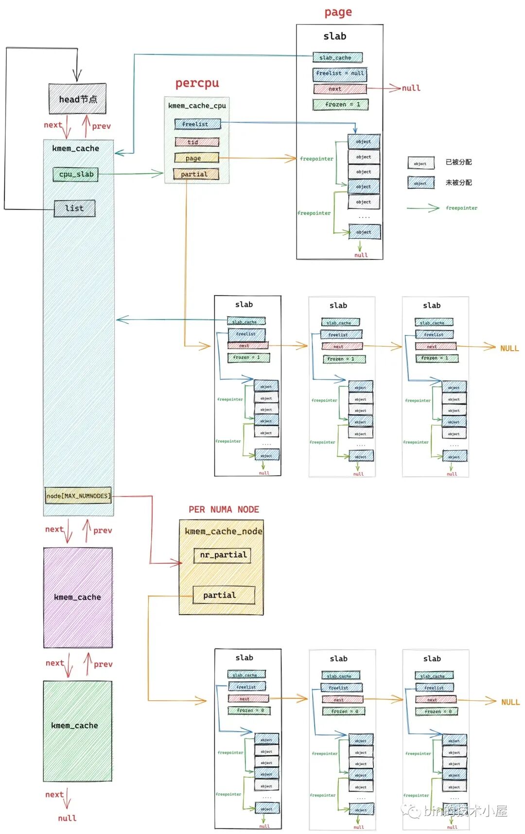 本文笔者将带大家继续从内核源码的角度继续拆解 slab cache 的实现细节,接下来笔者会基于上面这幅 slab cache 完整架构图,详细介绍一下 slab cache 是如何进行内存分配的。