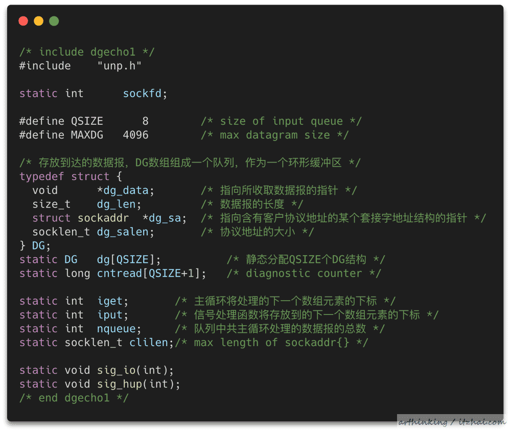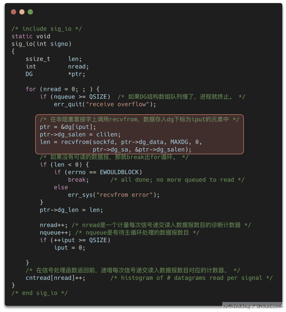 所以,针对UDP套接字产生的SIGIO信号,我们只要调用recvfrom读入到达的数据,或者获取发生的异步错误就可以了。