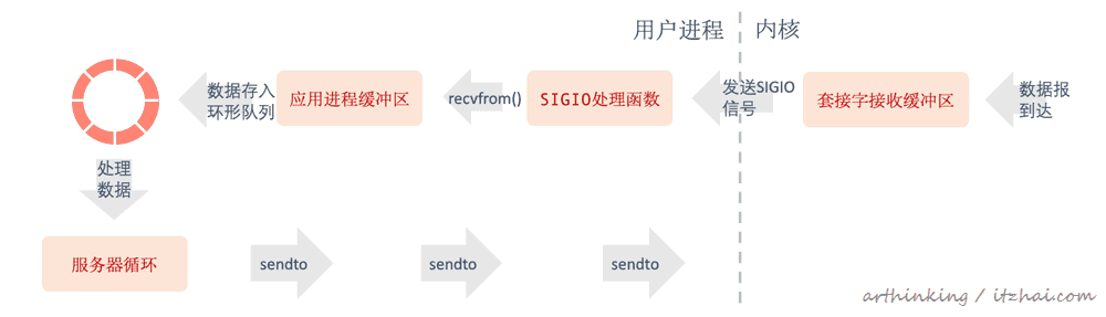 系统注册了ISGIO信号处理函数,并且启动了信号驱动式IO后,就可以继续执行程序了,等到数据报准备好之后,内核会发送一个SIGIO信号给应用进程,然后应用进程在信号处理函数中调用recvfrom读取数据报。