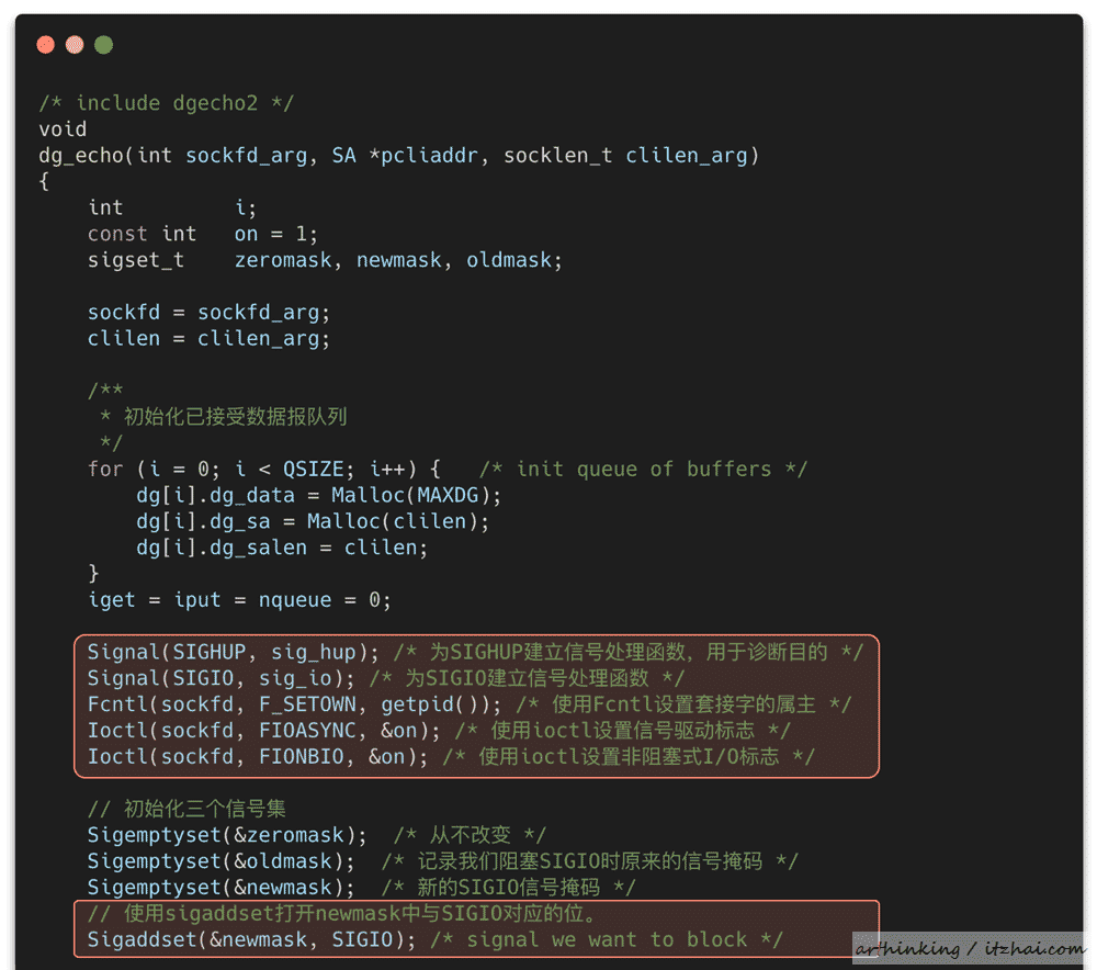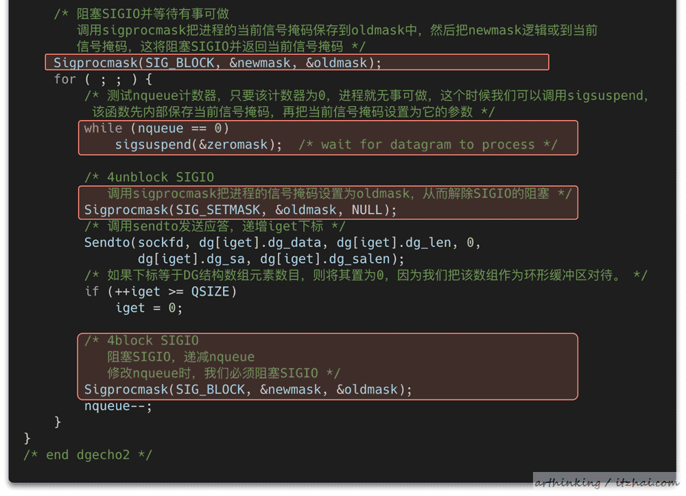 sigprocmask阻塞SIGIO来实现避免共享变量的竞争关系的。更多关于如何处理同步的技能,可以参考:一文带你彻底理解同步和锁的本质(干货)。