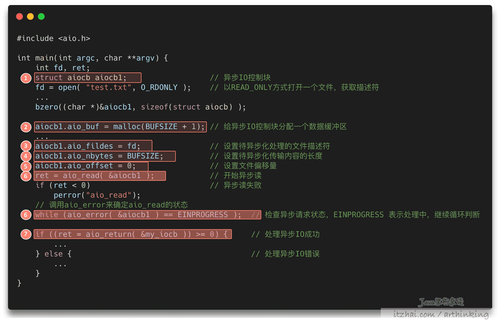 而对于异步read操作来说,可以同时执行很多异步IO read操作,所以这里需要的指明处理的文件的偏移量aiocbp->aio_offset和异步读取的内容的长度aiocbp->aio_nbytes。