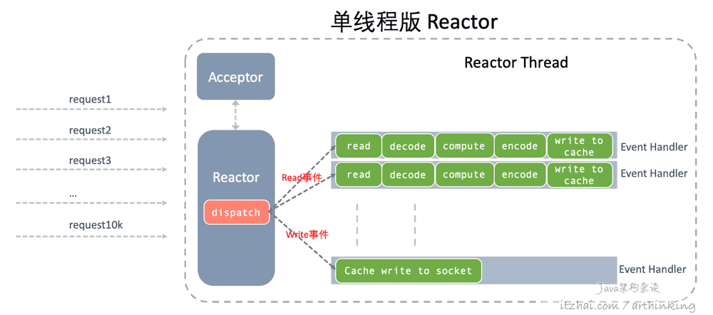 上面单线程版本的Reactor可能因为Event Handler处理速度太占用CPU时间,导致新请求进来的连接套接字不能及时通过Reactor注册到Synchronous Event Demultiplexer中进行IO轮训,相关IO事件得不到处理,简单来说就是新的连接服务器不能及时处理,也就是IO分发效率不高。