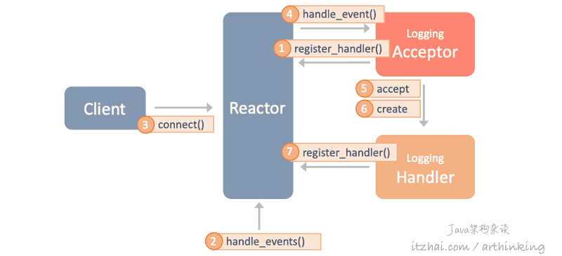 6:Proactor根据响应的事件类型调用到不同的Handler中进行业务处理。