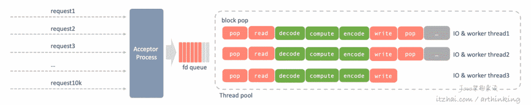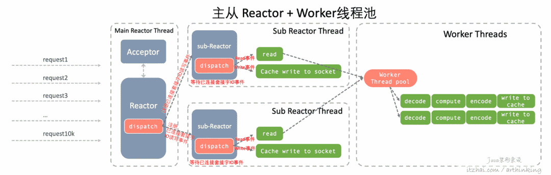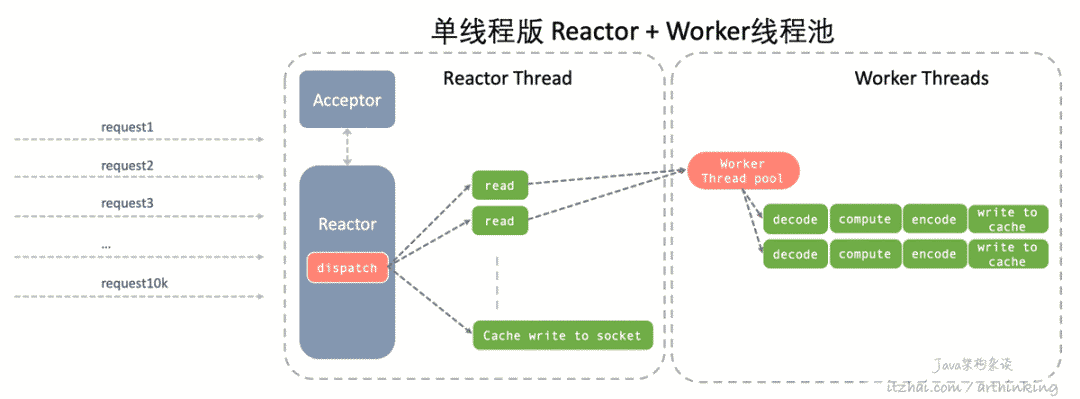 这样,实际业务处理相关工作,都放到了Worker Thread pool中,Reactor反应堆只处理IO相关任务,实现了业务和IO的解耦。