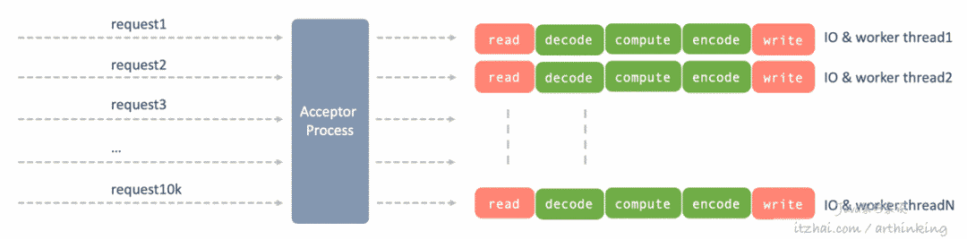 Acceptor Process把每个已连接套接字单独交给一个子进程处理,这个子进程同时处理了IO和具体的业务处理工作,所以也称为IO & worker process。