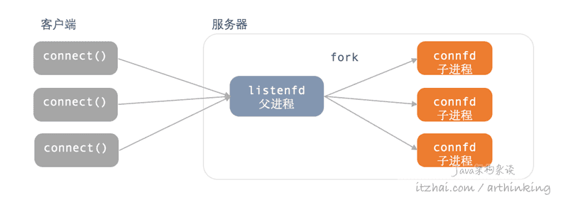 这是比较传统的一种处理方式,并发服务器调用fork派生一个子进程来处理每个连接。