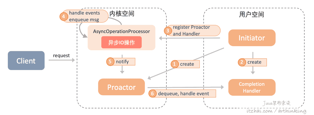 Initiator启动程序分别创建Proactor和Completion Handler对象,通过AsyncOperationProcessor将它们注册到内核中; -
