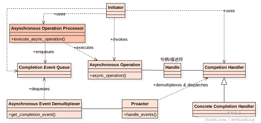 Intiator:应用程序本地的对象,用于启动异步操作,向异步操作处理器注册完成处理程序,启动Proactor主动器。