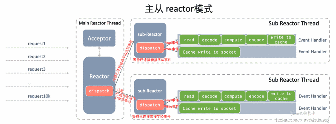 主Reactor线程只负责执行dispatch阻塞等待监听套接字的连接事件,当有套接字连接之后,随机选择一个Sub-Reactor,把已连接套接字的IO读写事件注册到选择的sub-Reactor线程中,Sub-Reactor线程负责阻塞等待已连接套接字的IO事件的到来,并且调用IO事件的Event Handler处理IO读写事件。这样就实现了IO的高效分发。