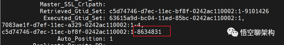 这里 Executed_Gtid_Set 的集合为 1-8634831,而 Retrieved_Gtid_Set 为 1-9101426,说明从库有些 GTID 是没有执行的。从库已经执行到了 8634831,下一个要执行的 GTID 为 8634832。