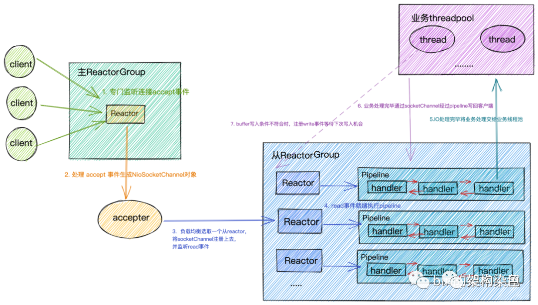 reactor中可被注册多个NioSocketChannel,这个reactor监听所有的被分配的NioSocketChannel的读写事件 , 如果监听到客户端的数据发送事件 , 将对应的业务逻辑转发给NioSocketChannel中的pipeline里的handler链进行处理 -