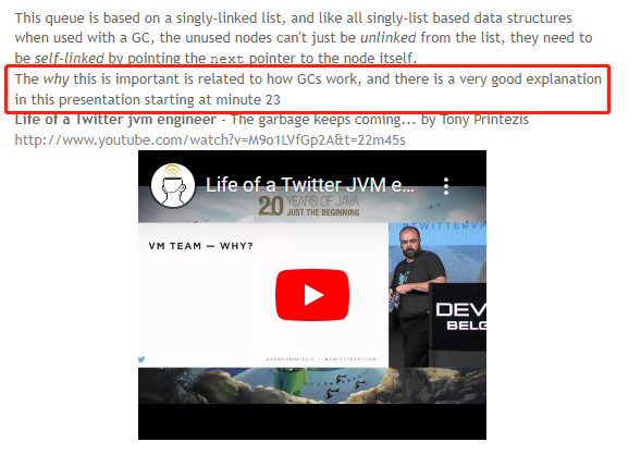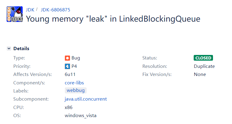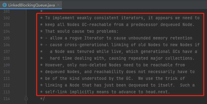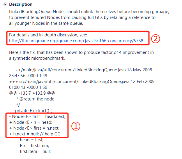 点击进这个链接的原因是标题当时就把吸引到了,翻译过来就是说:LinkedBlockingQueue 的节点应该在成为“垃圾”之前解除自己的链接。