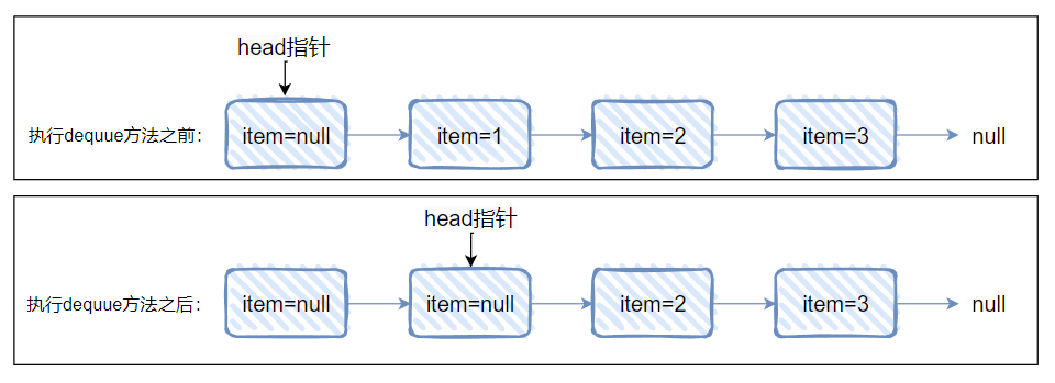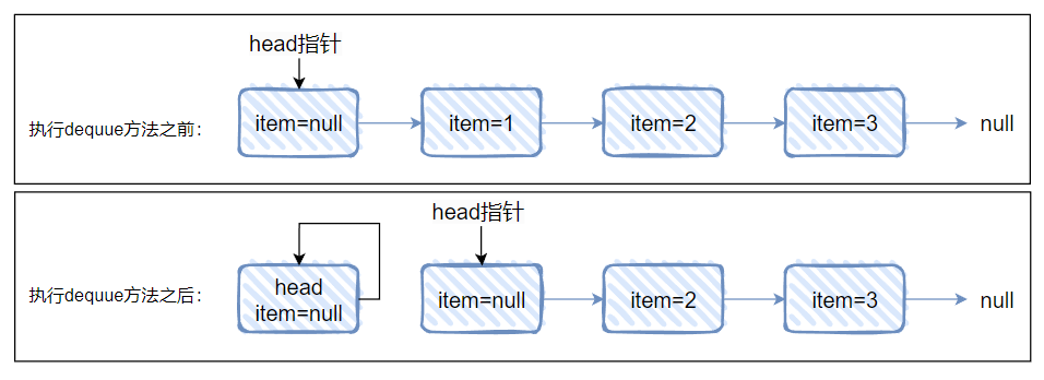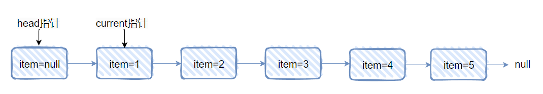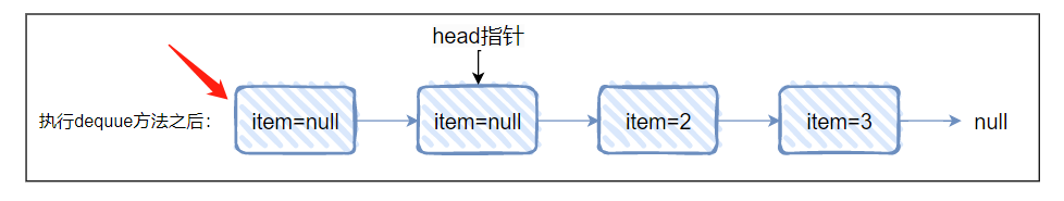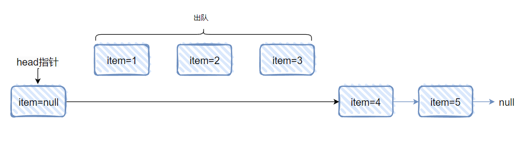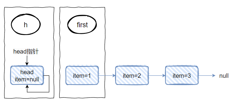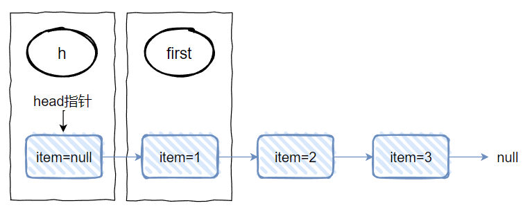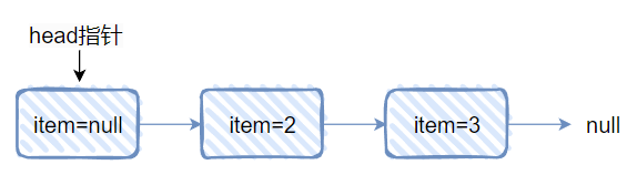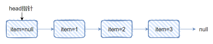 这是一个单向链表,然后 head 结点里面没有元素,即 item=null,对应做个图出来就是这样的: