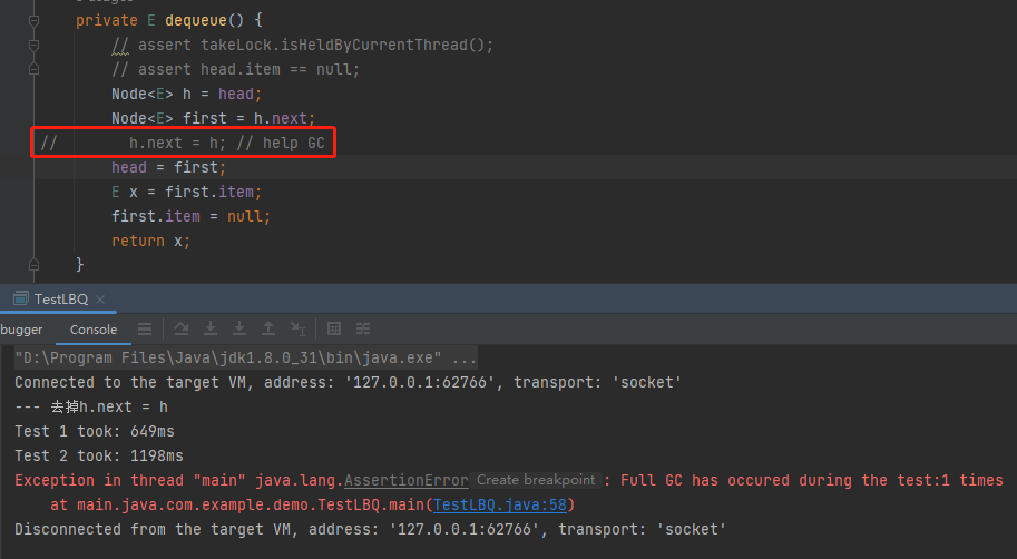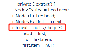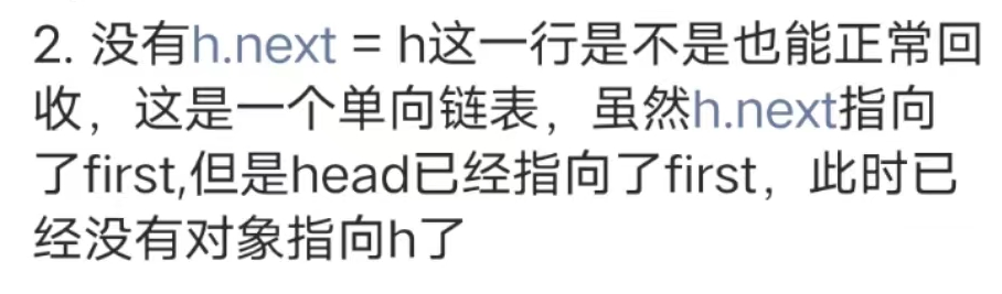 而且,经过前面的分析我们可以知道,理论上,h.next=null 和 h.hext=h 都能达到 help GC 的目的,那么为什么最终的写法是 h.hext=h 呢?