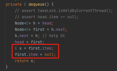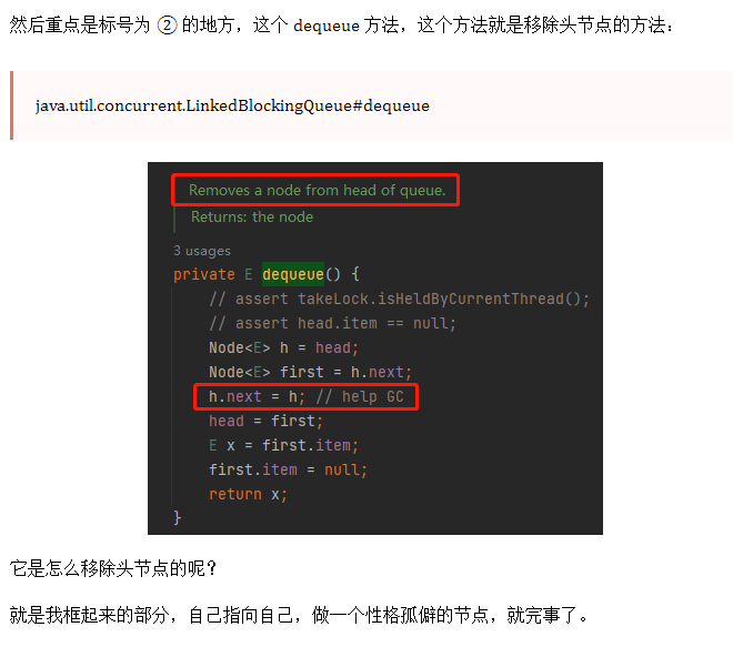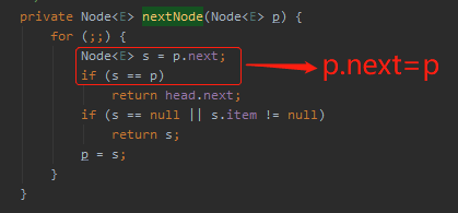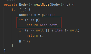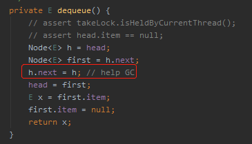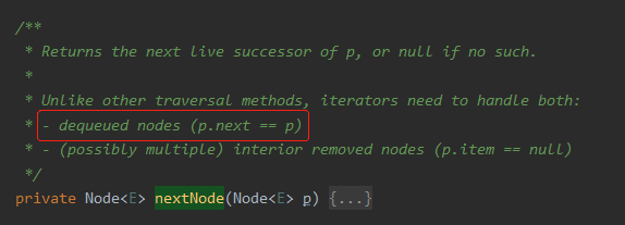 答案就藏在这个方法的注释部分:dequeued nodes (p.next == p)