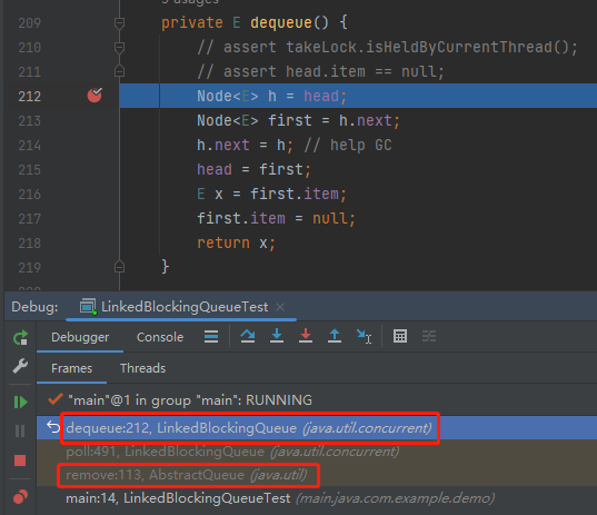 在 LinkedBlockingQueue 的 remove 方法中就调用了 dequeue 方法,调用链路是这样的: