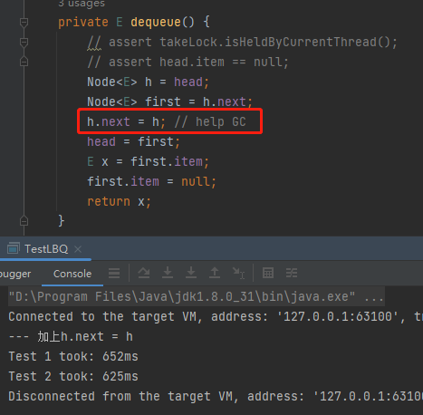 当 LinkedBlockingQueue 里面加入了 h.next=null 的代码,跑上面的程序,输出结果是这样: