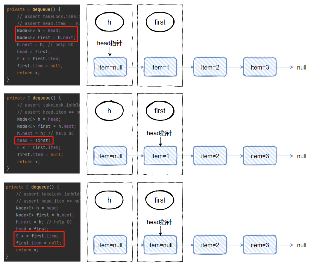 拿到 first 的 item 值,作为方法的返回值。然后再把 first 的 item 值设置为 null。