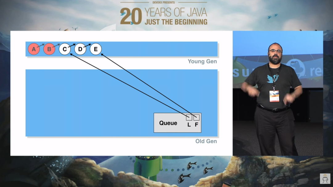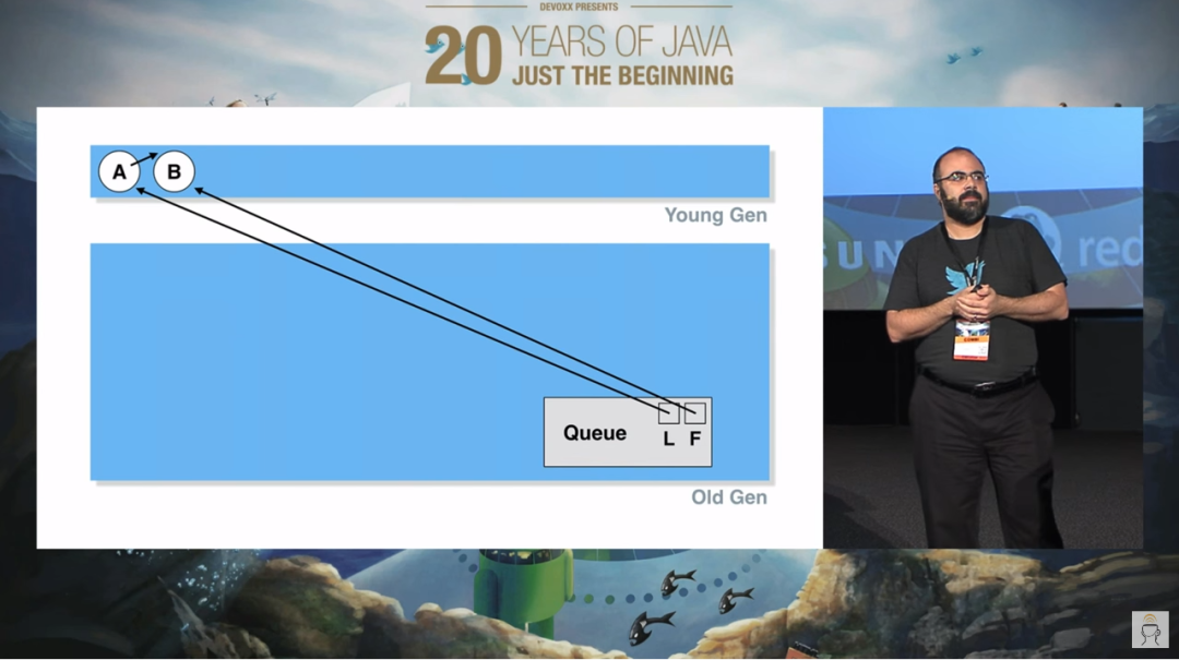然后我们往这个队列里面插入了 A,B 两个元素,由于这两个元素是我们刚刚插入的,所以它们在年轻代,也没有任何毛病。