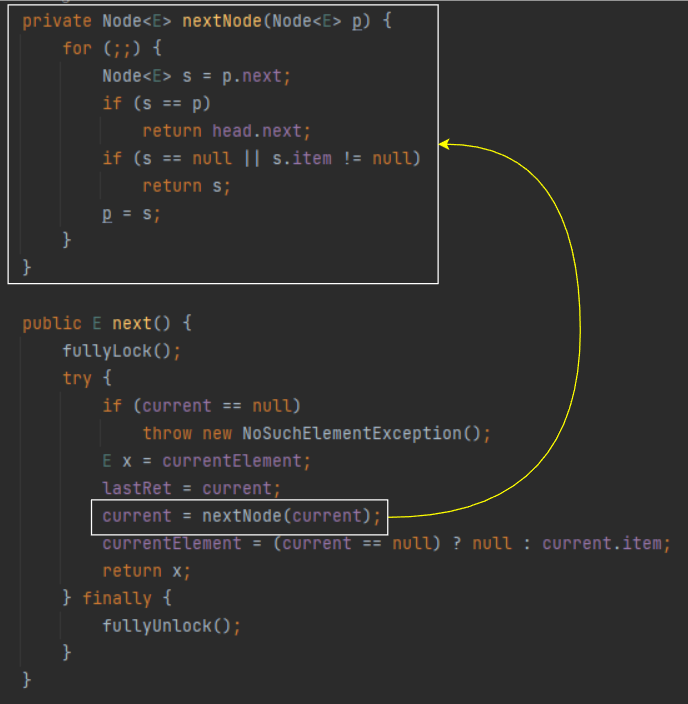 current,这个变量是在生成迭代器的时候就初始化好了的,指向的是 head.next: