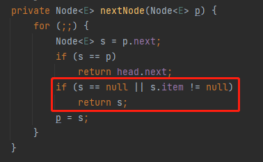 当 1 节点的 next 指为 null 的时候,即 p.next 为 null,那么满足 s==null 的判断,所以 nextNode 方法就会返回 s,也就是返回了 null:
