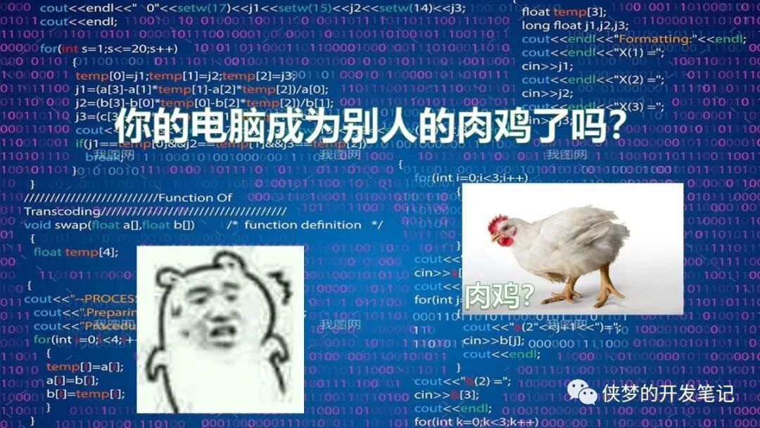 肉鸡不是吃的那种,是中了木马,或者留了后门,可以被远程操控的机器,许多人把有WEBSHELL权限的机器也叫肉鸡。谁都不希望自己的电脑被他人远程控制,但是很多人的电脑是几乎不设防的,很容易被远程攻击者完全控制。