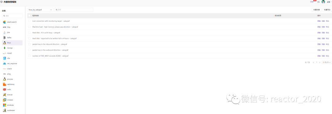 【内置规则】菜单主要提供系统中内置的一些告警规则,按照组件类型进行分类分组: