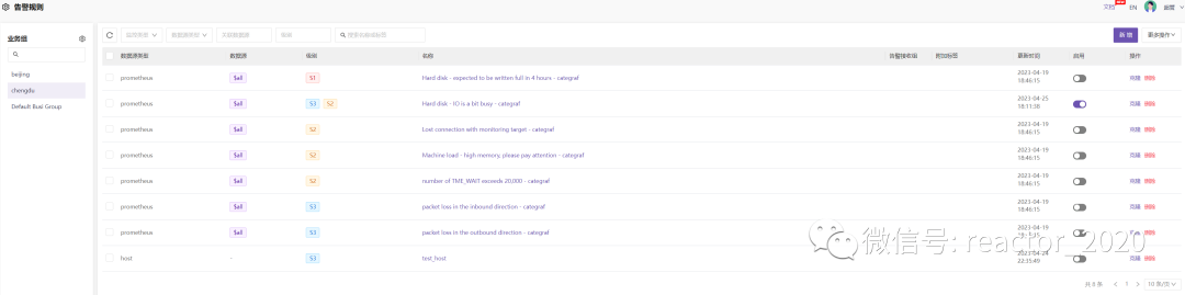 【告警规则】菜单用于管理每个业务组的告警规则,这些告警规则一方面是从【内置规则】克隆方式导入的,另一方面也可以【新增】方式创建: