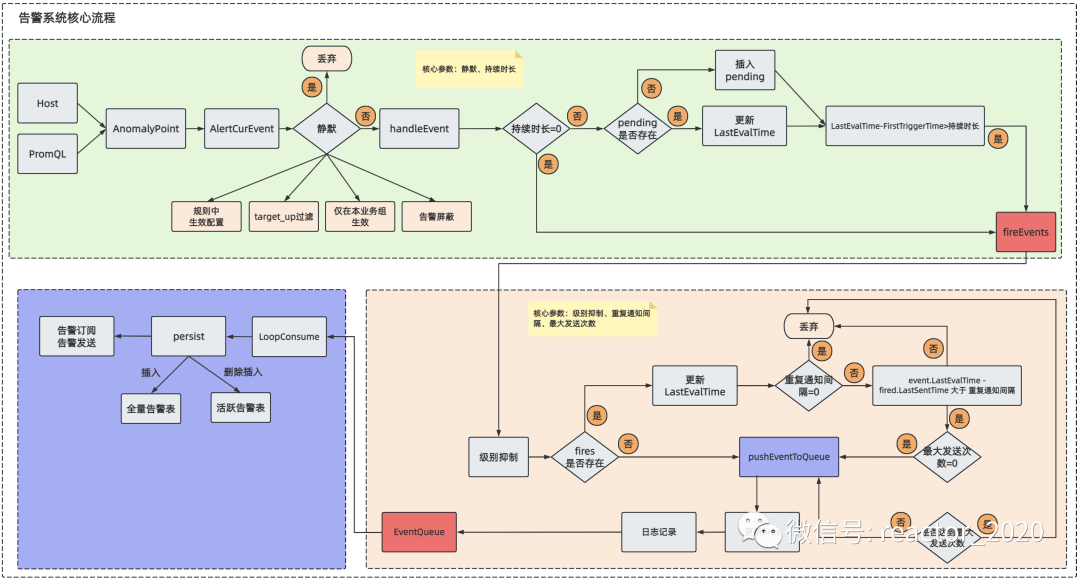 1、对告警系统整个核心流程梳理,可以分为三个主要阶段(「注意图中红色方块重要节点」):第一个阶段完成基于异常点构建告警事件;第二个阶段基于告警事件计算告警是否触发;第三个阶段则是告警触发后置处理,包括持久化、告警发送等处理。