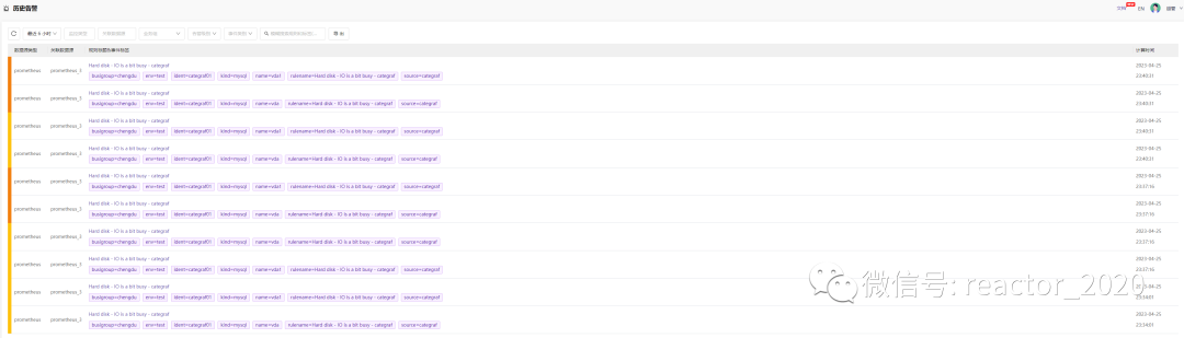 【历史告警】菜单展示全量告警信息,包括所有历史触发过的告警:
