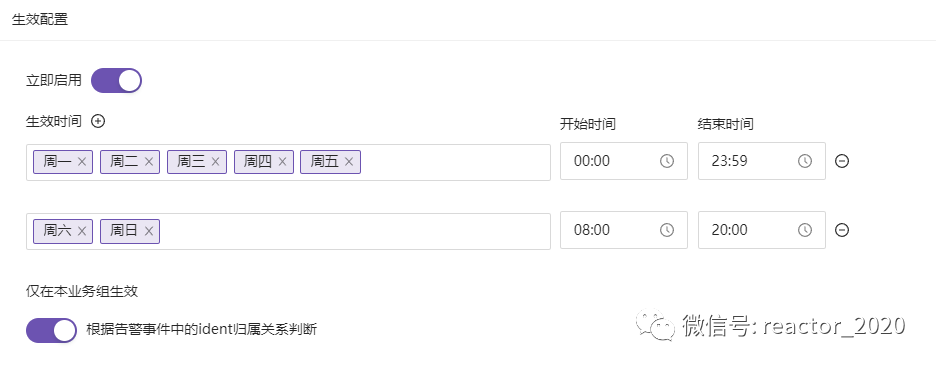 系统提供的生效时间还是比较灵活,比如可以细化到星期几的哪个时间区间告警; -