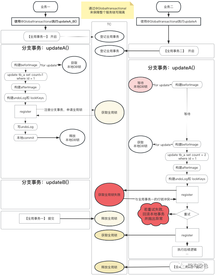 注意:业务二提交本地事务后,从其处理上下文来看,已经具备了写隔离性,但是不能就此打住,因为业务二所获取的全局锁还没释放,所以接下来还要再做全局事务的提交,通过提交全局事务将其所添加的全局锁释放掉。释放全局锁似乎略显得多余,可试试推理全局锁的添加是否有必要;注意看,业务二整个事务中只有一个分支事务updateA(),从上下文来看,保障其写隔离,只需要在获取本地锁后判断一下全局锁是否存在,若存在就等其他全局事务结束后再处理,若全局锁不存即表明没有其他全局事务存在,可放心提交本地事务;这块内容是为了下文@GlobalLock做铺垫, @GlobalLock恰是应对不必引入整个全局事务的这种场景,此处先探讨至此。