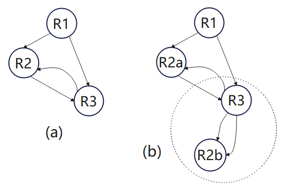 图(b)中所示的**将边R2b->R3变成了循环边,此时R3支配R2b,这两个区域可以合并为一个新区域。由此产生的三个区域(R1、R2a和新区域)形成一个非循环图。此时,我们可以将整个流程图简化为单个区域。一般来说,可能需要额外的拆分,在最坏的情况下,基本块的总数可能会成为原始流图中块数的指数。