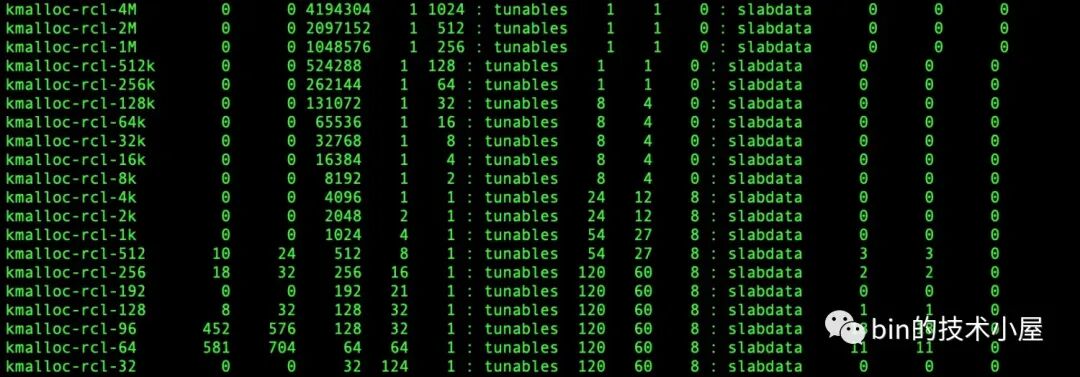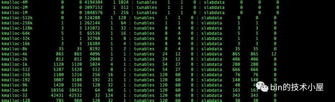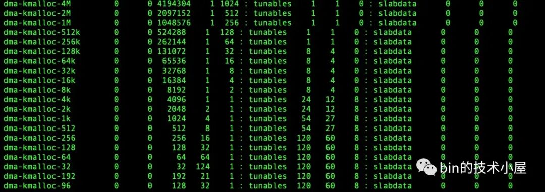 name 为该通用 slab cache 的名称,名称形式为 kmalloc-内存块尺寸(单位字节),这一点我们可以通过cat /proc/slabinfo命令查看。