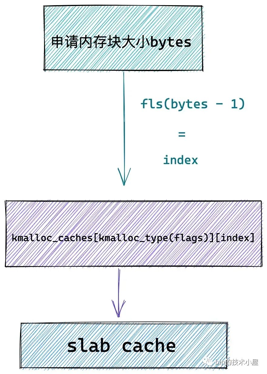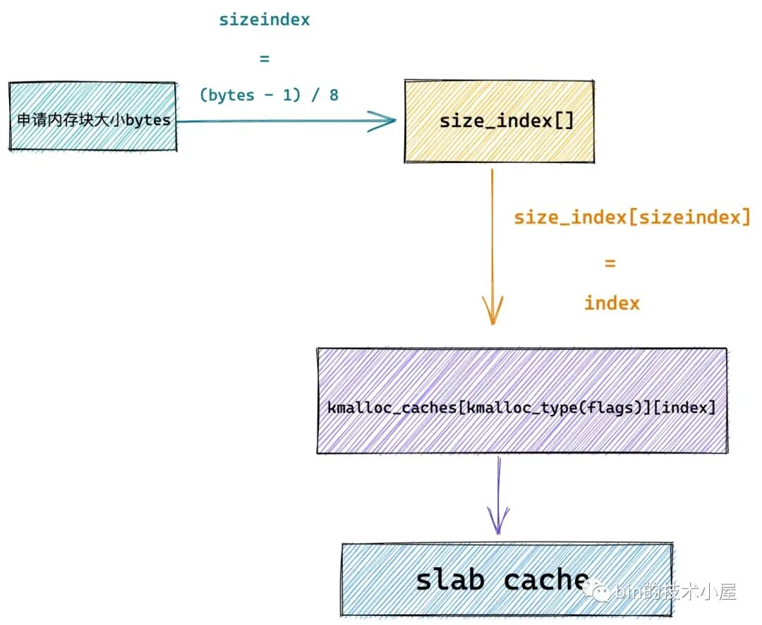 然后根据 size_index[sizeindex] 的值以及 gfp_t flags 中指定的 kmalloc_type 从 kmalloc_caches 中直接查找出最佳合适尺寸的 slab cahe 出来。