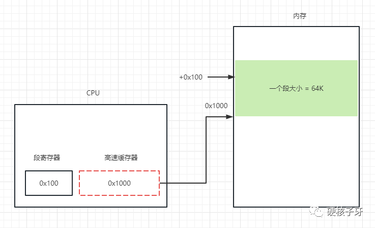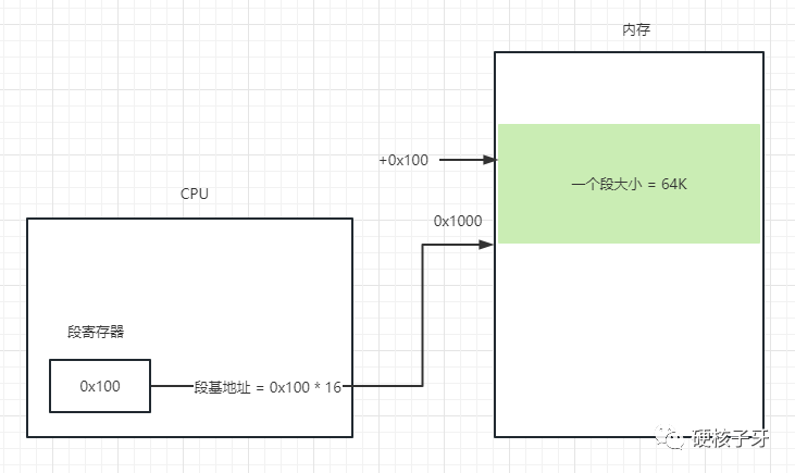 CPU会先取出段寄存器ds中的值0x100,左移4位,相当于乘以16,得到0x1000,这个就是段基地址,每个段的大小是2的16次方,即64KB。小括号中的0x100就是这个段内的偏移,所以真正访问的物理地址是0x1100