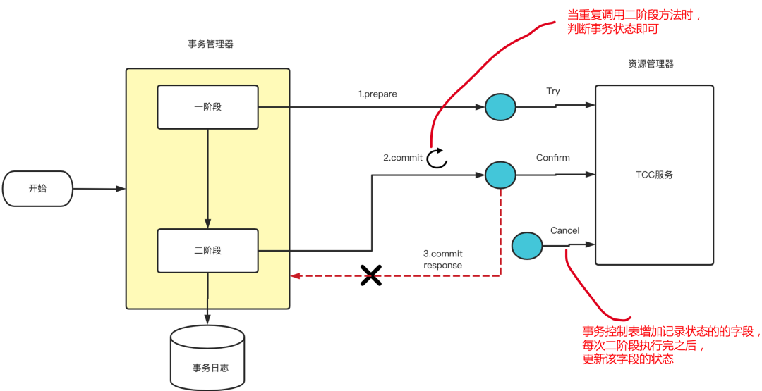 参与者执行完二阶段之后,由于网络抖动或者宕机问题,会造成 TC 收不到参与者执行二阶段的返回结果,TC 会重复发起调用,直到二阶段执行结果成功。