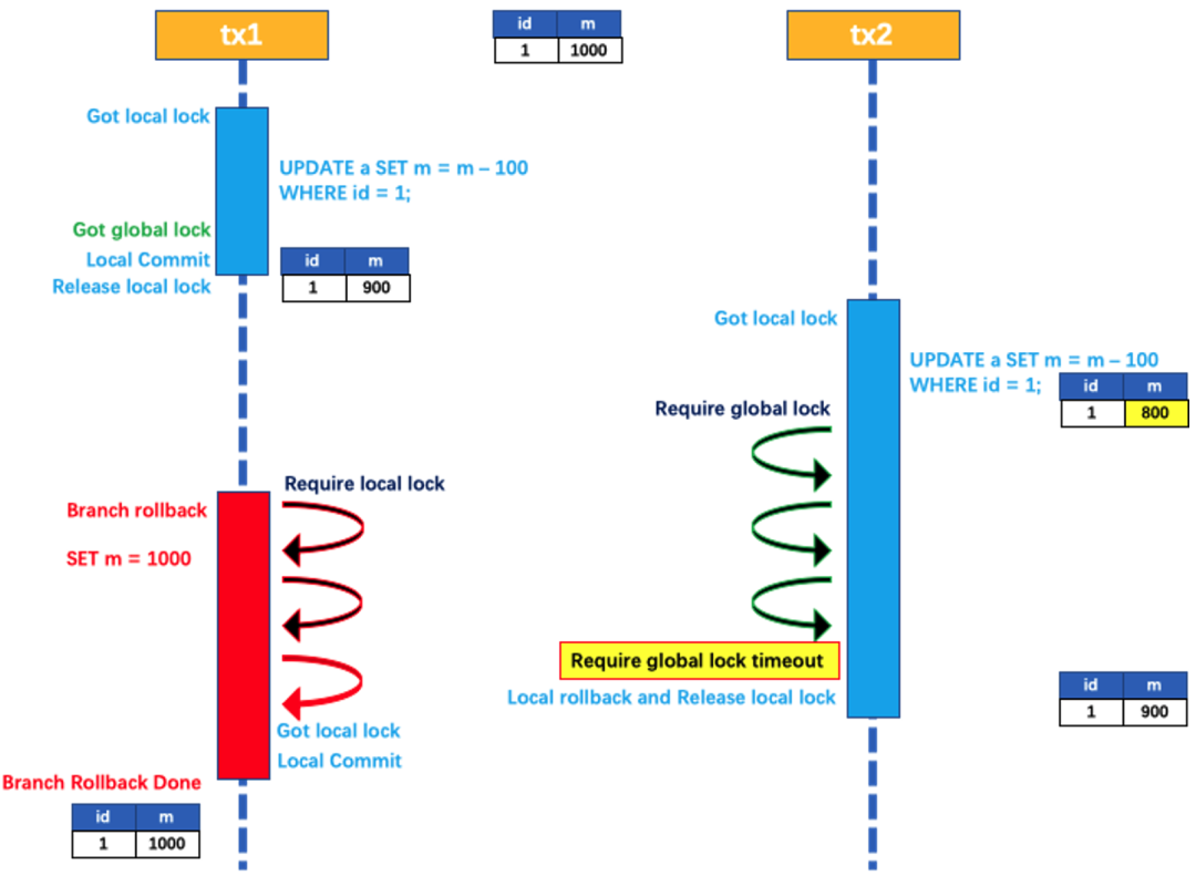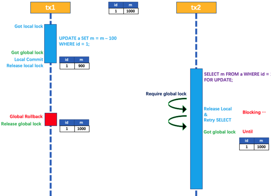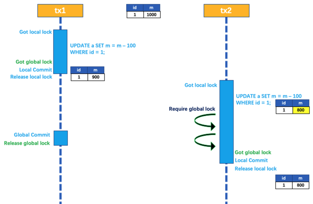 tx1 先开始,开启本地事务,拿到本地锁,更新操作 m = 1000 - 100 = 900。本地事务提交前,先拿到该记录的 全局锁 ,本地提交释放本地锁。tx2 后开始,开启本地事务,拿到本地锁,更新操作 m = 900 - 100 = 800。本地事务提交前,尝试拿该记录的 全局锁 ,tx1 全局提交前,该记录的全局锁被 tx1 持有,tx2 需要重试等待 全局锁 。